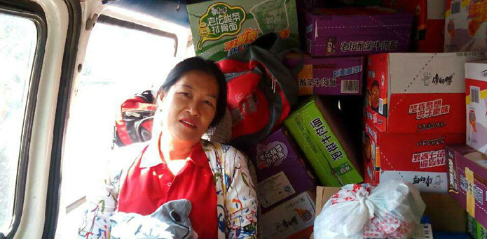 “爱心鸟”志愿者刘丽萍分发衣服