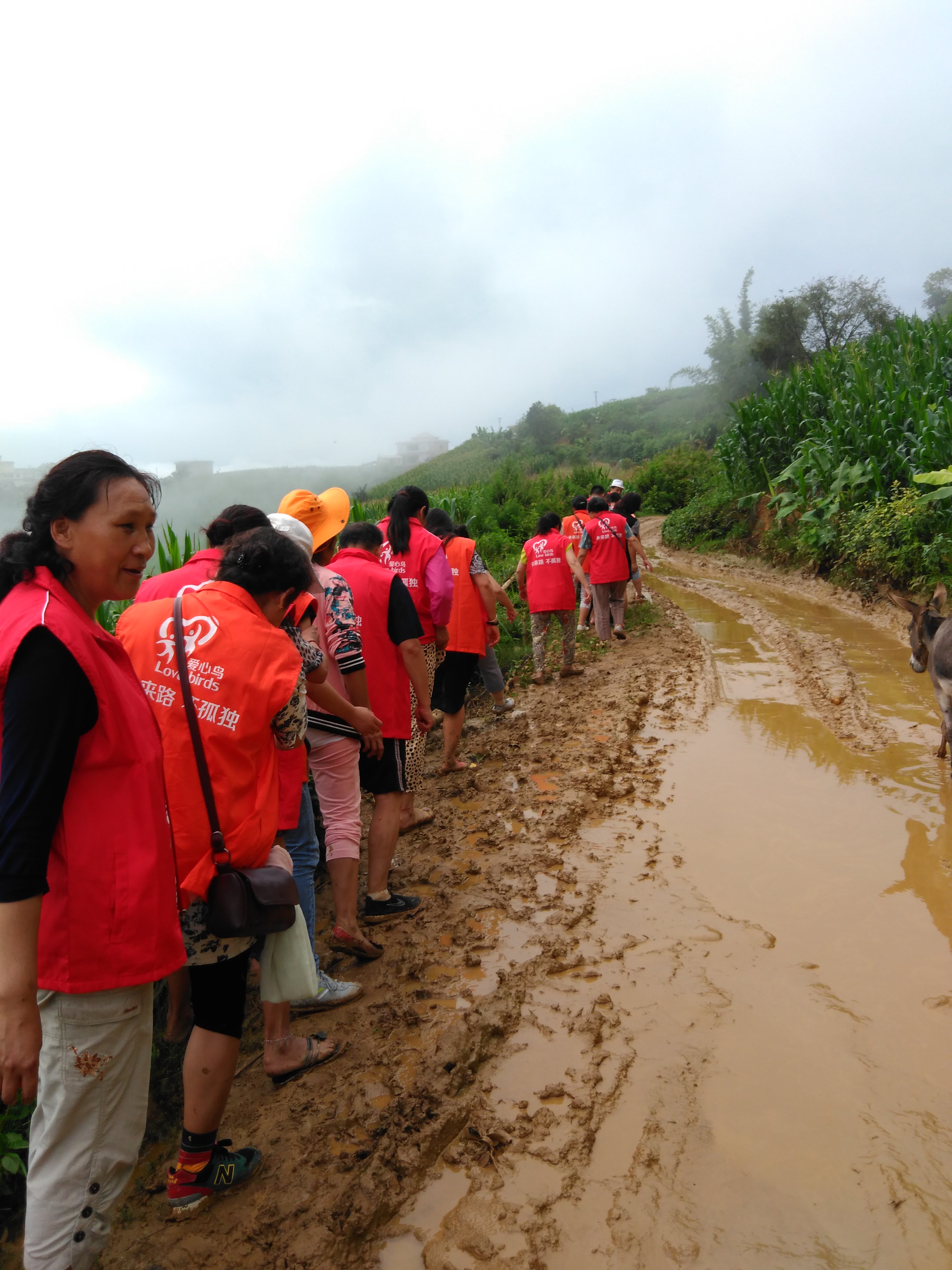 雨后的泥路也阻挡不了爱心鸟公益志愿者前行之路