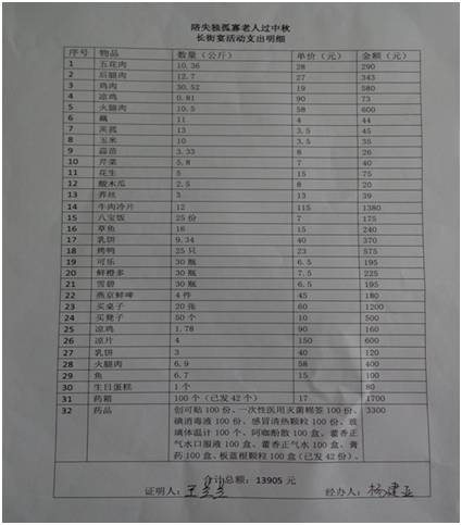 爱心鸟中秋长街宴公益项目以“陪失独、孤寡老人过中秋”为主题,号召社会各界爱心人士行动起来,以一瓶饮料之力助昆明幸福家园小区的200名失独、孤寡老人过上一个温馨的中秋。大家你5元、我10元、20元,把“小红包”汇聚成“大爱心”,共有348人次踊跃支持,累计筹集善款7520元。除去轻松筹平台收取总额的2%(150.4元)的平台费用,轻松筹公益善款总计:7369.6元。