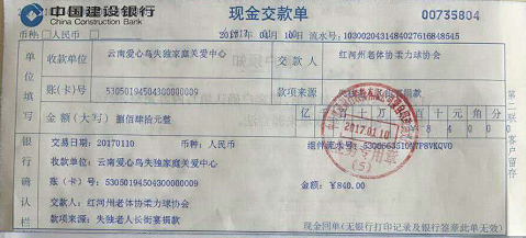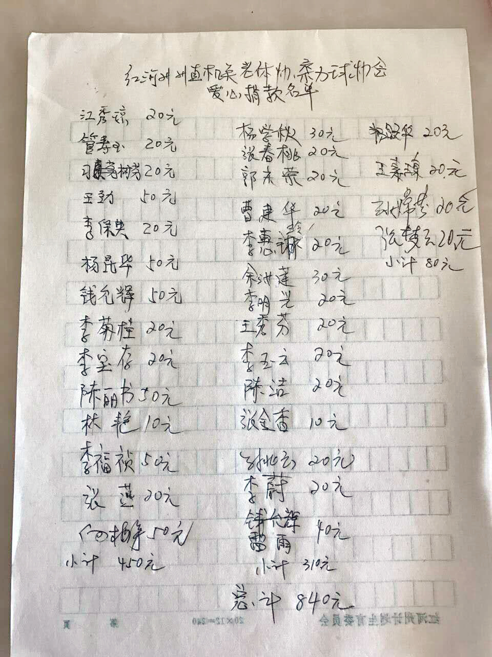 红河州直机关老体协柔力球协会捐赠爱心款840元