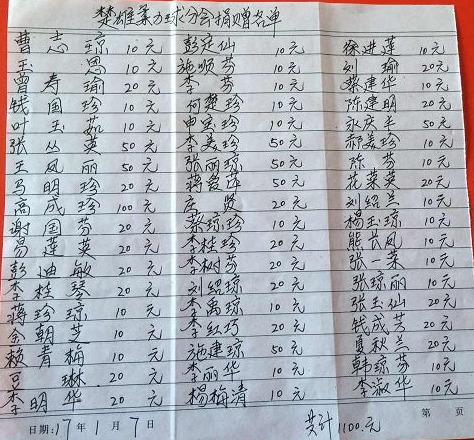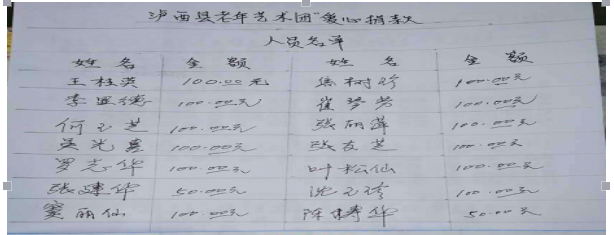 “我们也在泸西县老年艺术团发起了募捐,大家一起帮助失独孤寡老人吃上一顿温饱温馨团圆饭。”泸西的两乐球教练员崔琴芬老师线下发动队员们捐善款1300元。