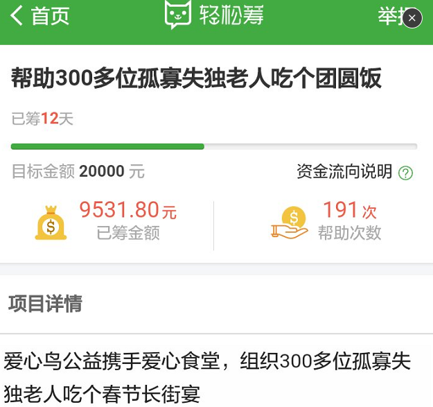截至1月11日15:00时许,轻松筹平台为300位失独孤寡老人吃团圆饭筹集9531.80元善款。