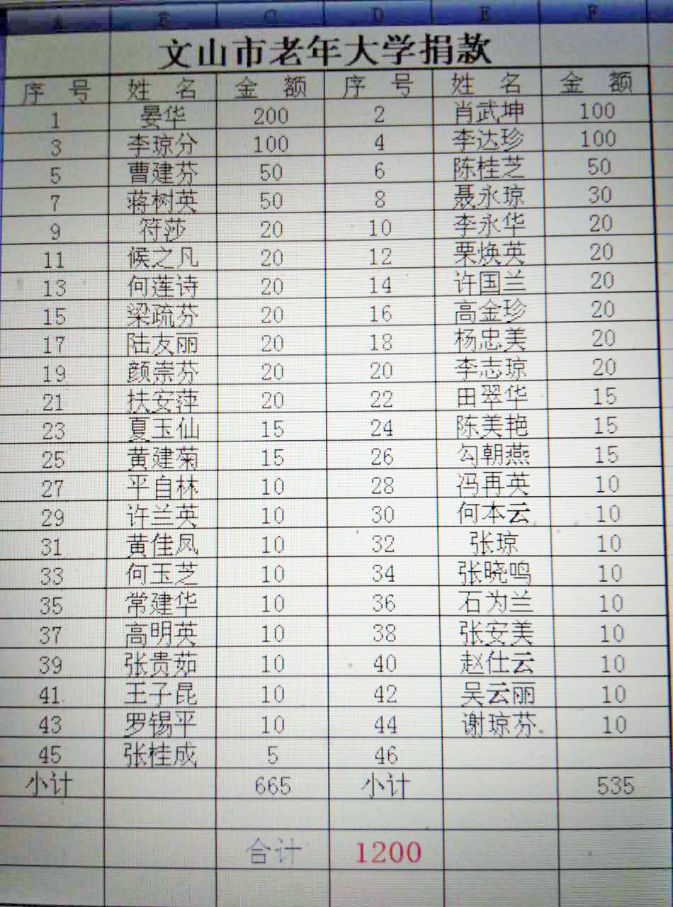 文山市老年大学两乐球学员募捐爱心款1200元。