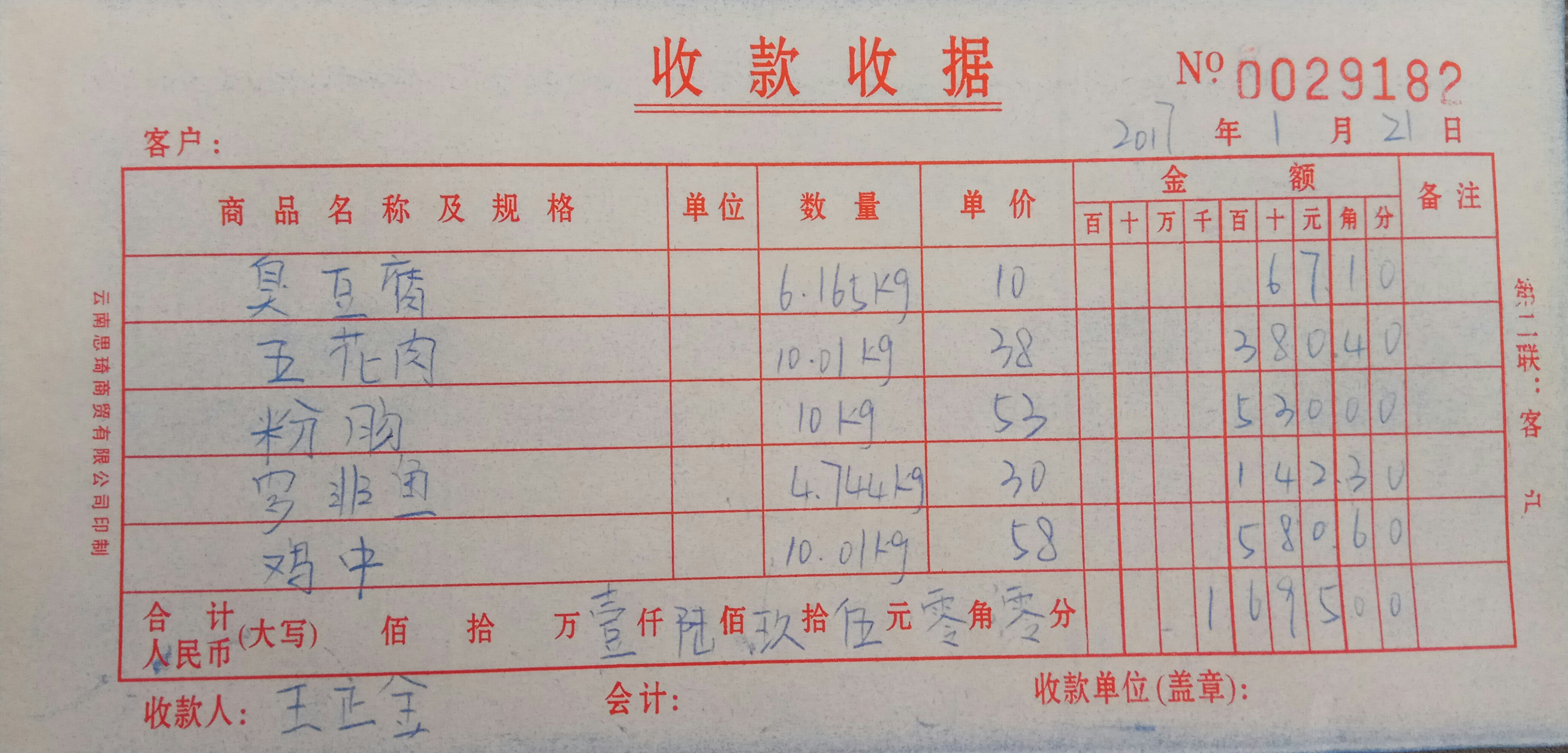 买臭豆腐、五花肉、粉肠、罗非鱼、鸡中1695元。