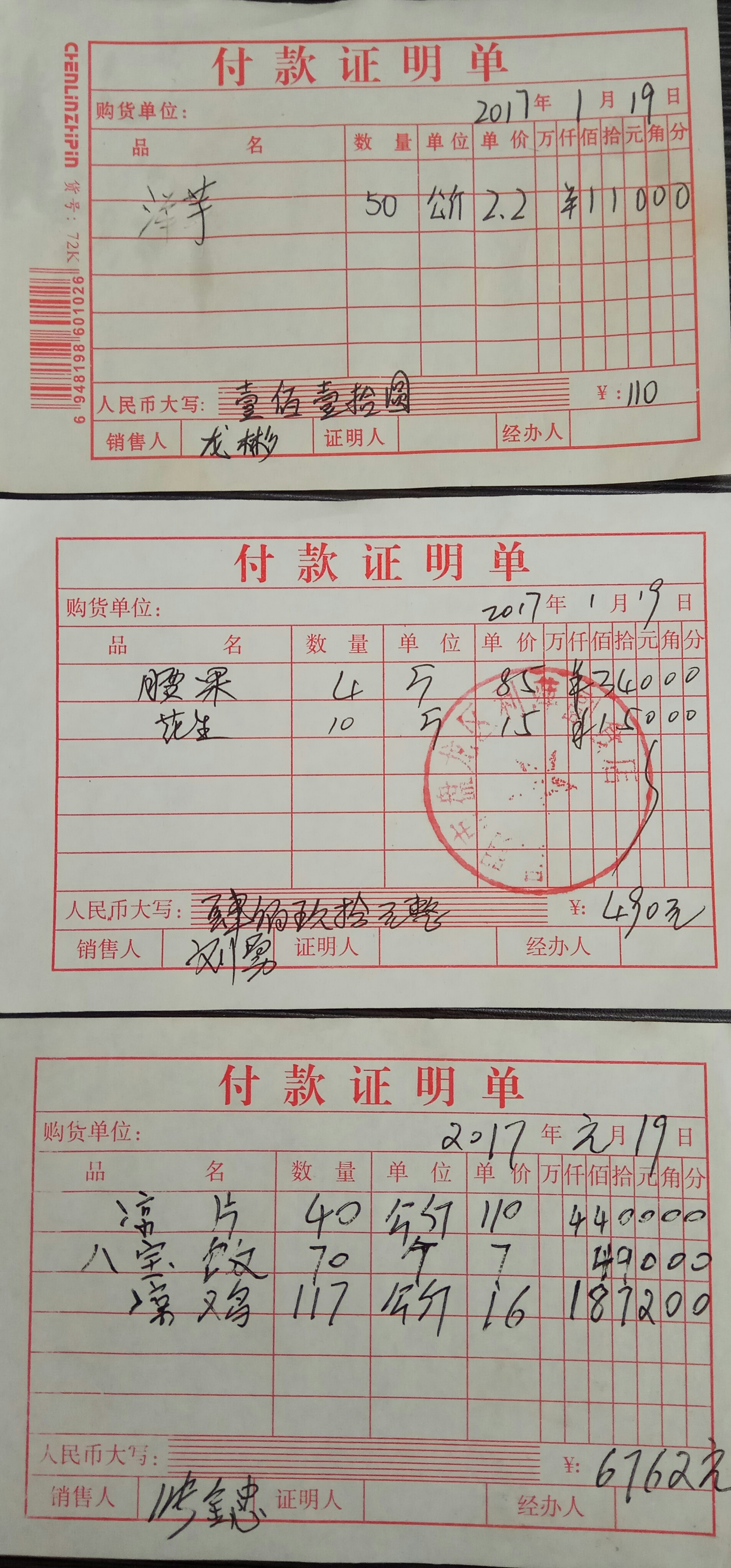 买洋芋、腰果、花生、牛肉凉片、八宝饭、凉鸡7362元。