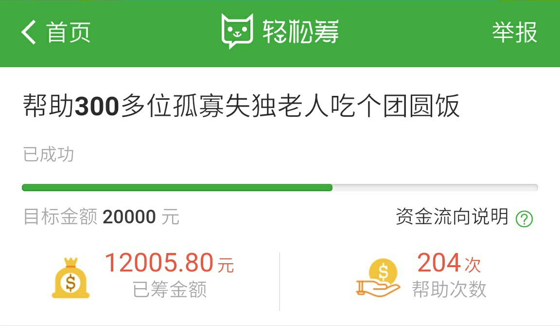 ①爱心鸟公益组织在“轻松筹”平台上,共有204人次参与支持,累计筹集善款12005.80元。除去轻松筹平台收取总额的2%(240.116元)的平台费用,轻松筹公益善款总计:11765.68元。