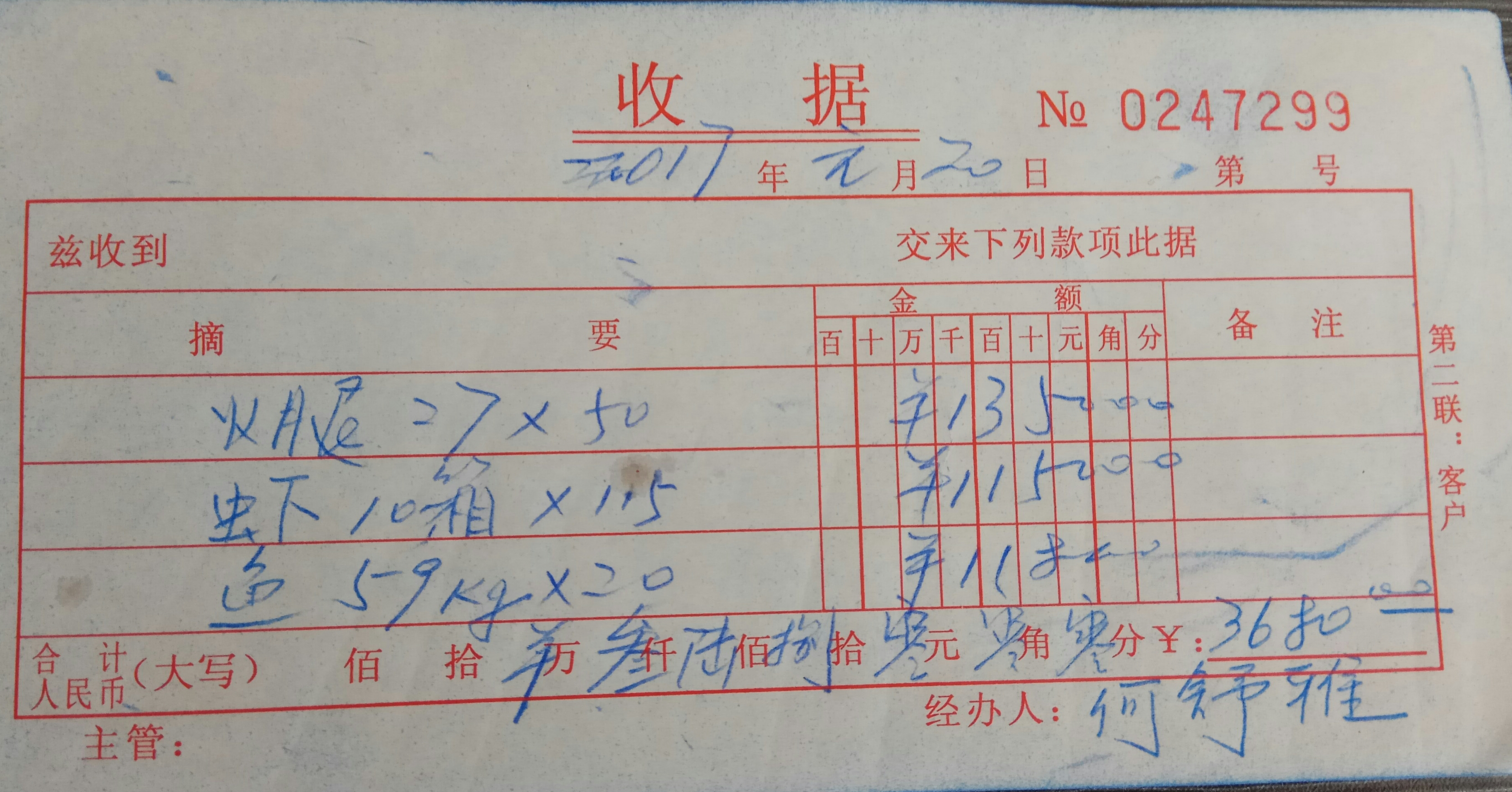 买火腿、虾、鱼3680元。