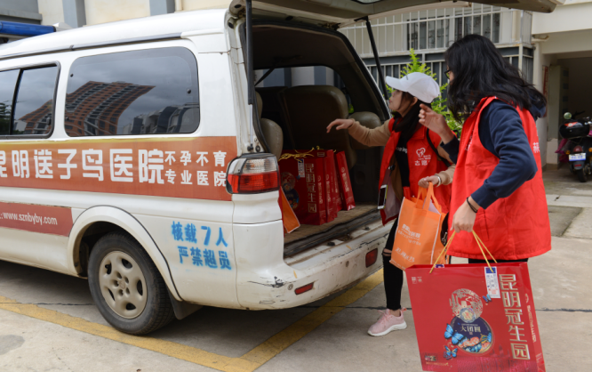 图说:爱心企业昆明送子鸟医院为本次活动捐赠了100盒月饼。