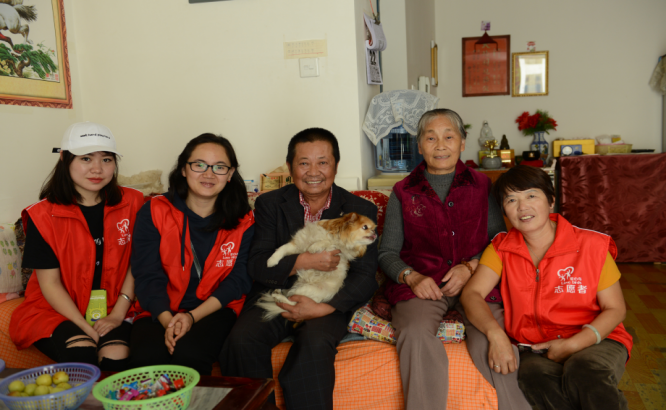 图说:失独老人朱阿姨(右二)说,她家啥都不缺,就是缺人气儿。爱心鸟志愿者的到来,让她感到很温暖。