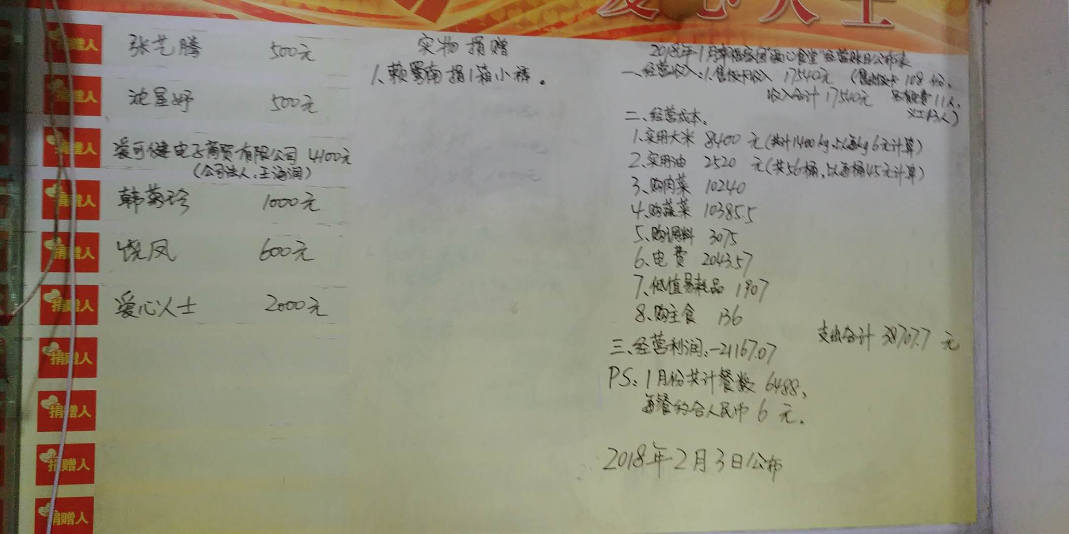 爱心食堂财务公开栏显示:2018年1月亏损21167.07元。