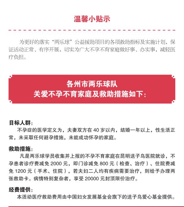 据悉,为帮助更多的老小孩们圆上求子求女梦,今年云南省老年人体育协会携手昆明送子鸟医院面向全省开展云南两乐球公益健身项目援助行动,关爱不孕不育家庭和失独家庭。救助对象为结婚一年以上未能成功怀孕的育龄夫妇。专家预约热线:0871—68021111。