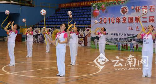 此次比赛在安徽铜陵举行,共有来自上海、浙江、南京、云南等全国各地18支代表队、300余名中老年运动员参加。在此次比赛中,由云南省老体协自主创编的《送子鸟•感恩情》自选套路参赛节目成为盛会一大亮点。