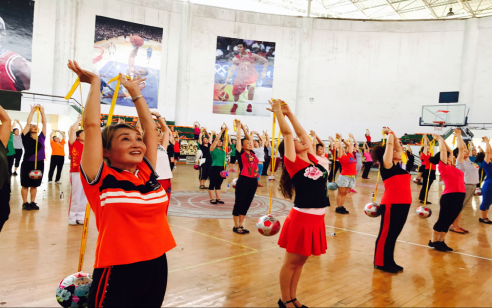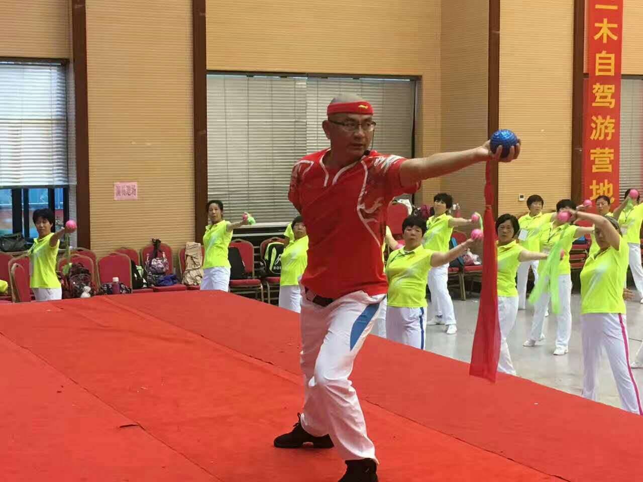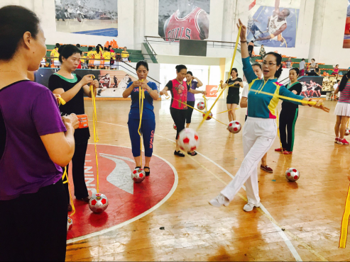 图说:早在今年6月初,国家级社会体育指导员、云南省老体协副秘书长周晓峰受邀担任2017中国第二届柔乐球培训暨邀请赛主教练,并对400余名学员进行普及培训柔乐球基本动作套路《送子鸟·感恩情》。