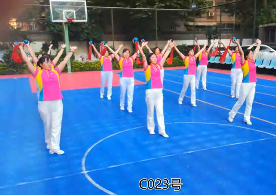 图说:与C023号参赛队伍一样,第三届全国柔乐球网络视频比赛有33支队伍,500余人选择C项目:柔乐球基本动作套路《送子鸟·感恩情》参赛。